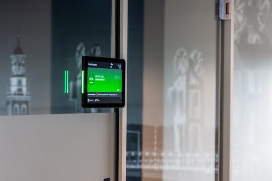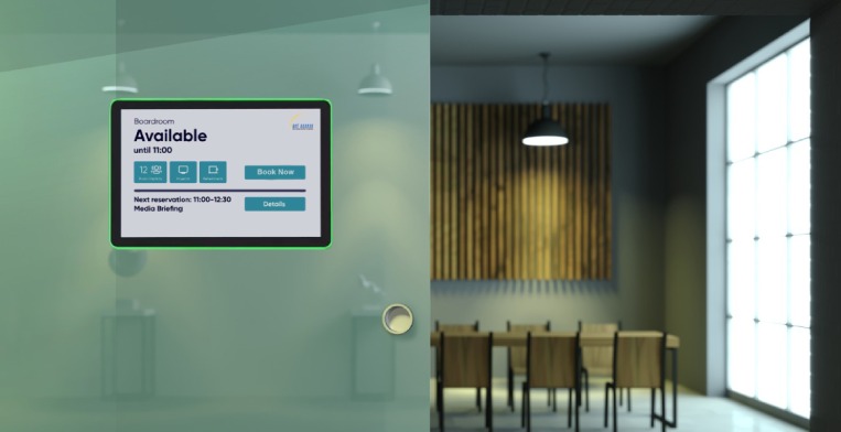 Wall-mounted touch panels display real-time room availability outside each meeting room.